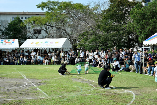 4歳児の親子競技は「玉入れ」…ただの玉入れではなく、カゴを背負った父母の会の役員さんが逃げ回り、難度も高くなります。しかし、親のチームに捕まり、とうとう反則勝ちで子ども達の勝利でした。