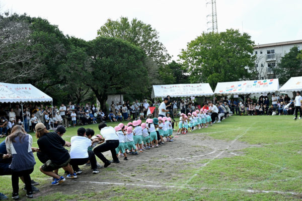 3歳児の親子競技は昭和の香りのする「綱引き」 ばら・れんげ組に分かれ、親子で力を合わせて”ヨイショッ!”と引っ張り合います。さあて勝敗は?