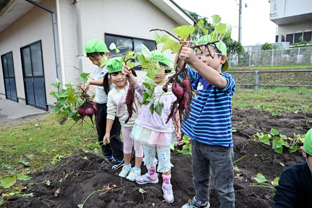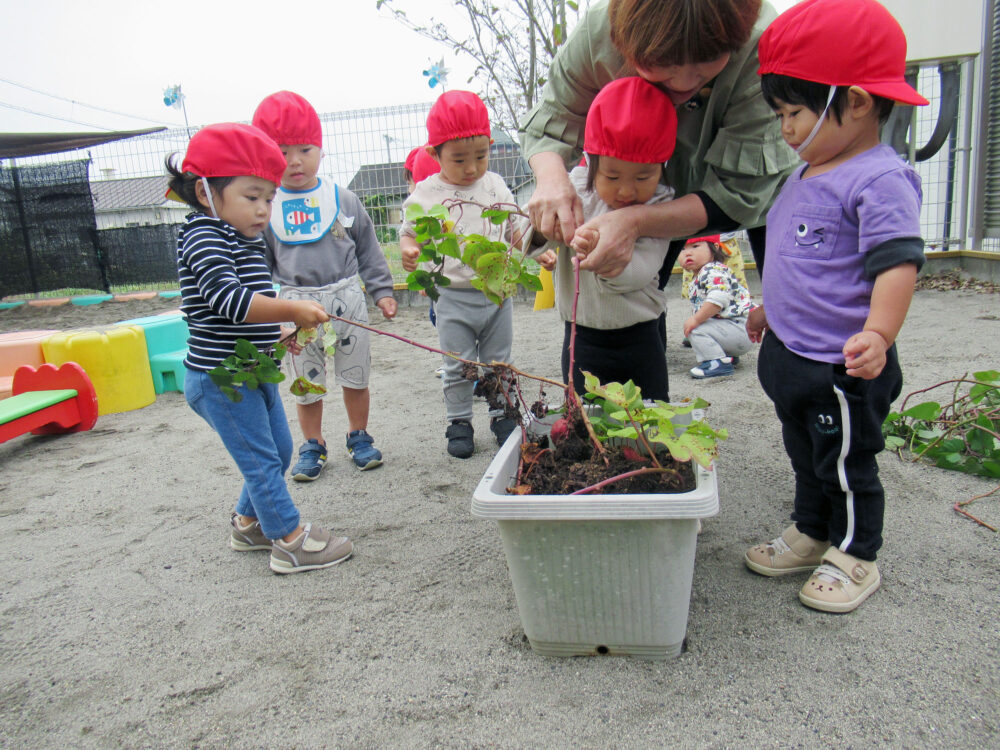 分園でもお芋割りが始まりました。大きなかぶのお話のように、つるを引っ張るとお芋が見えてきました。