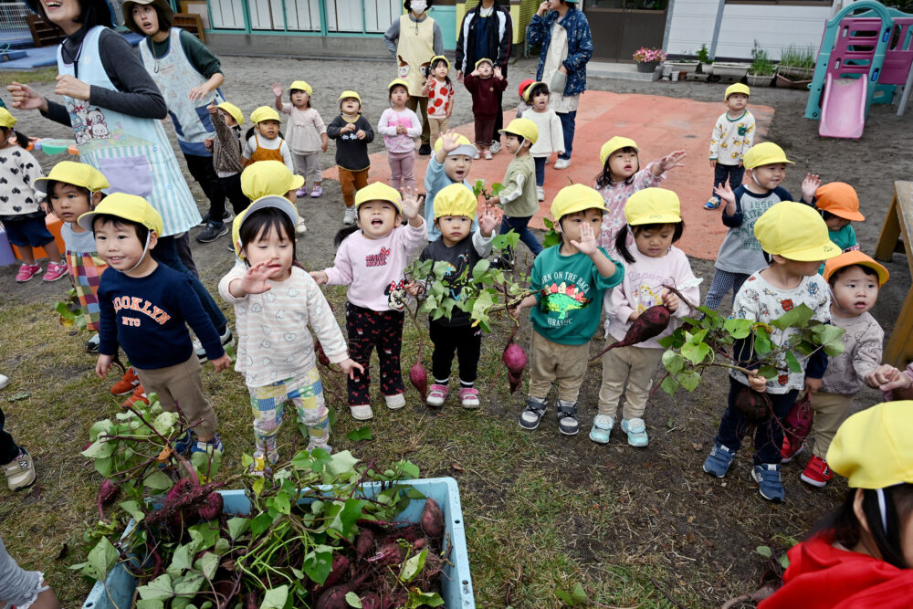 2歳児のクラスもお芋がいっぱい掘れました(?) 空を見上げるとヘリコプターが飛んでいて、一斉に「バイバーイ」と手を振ります。大きな声が届けばいいですね!