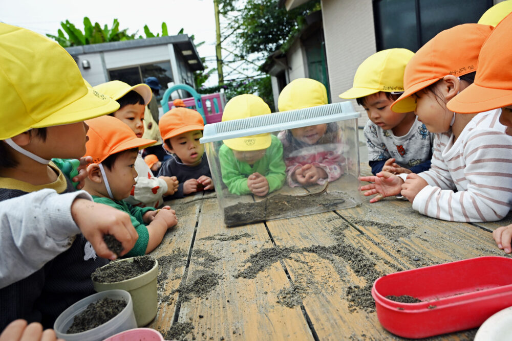 お芋を収穫した畑からは「カナヘビ」が2匹!飼育箱に入れてみんなで観察中。お芋よりも気になるようです。