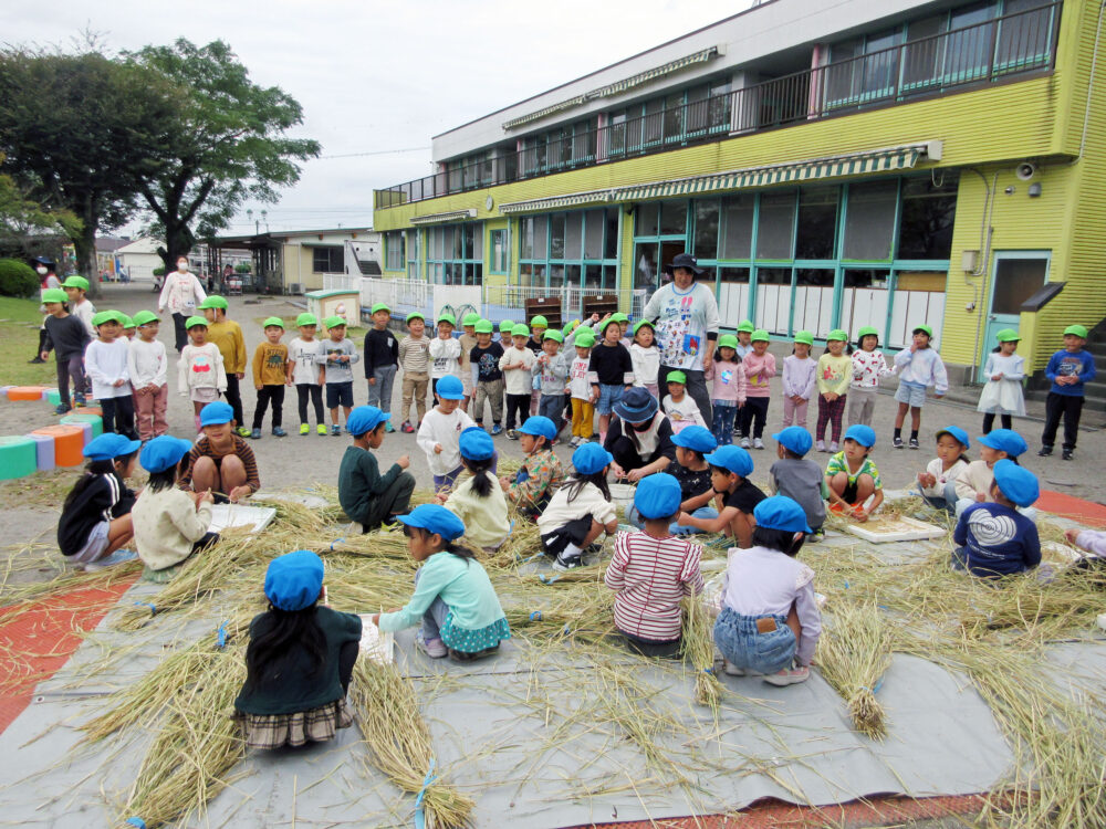 年長組は、稲刈りが終わり、脱穀の段階を迎えました。なかなか難しいようです。来年は、見学中の黄緑帽子の4歳児が体験します。