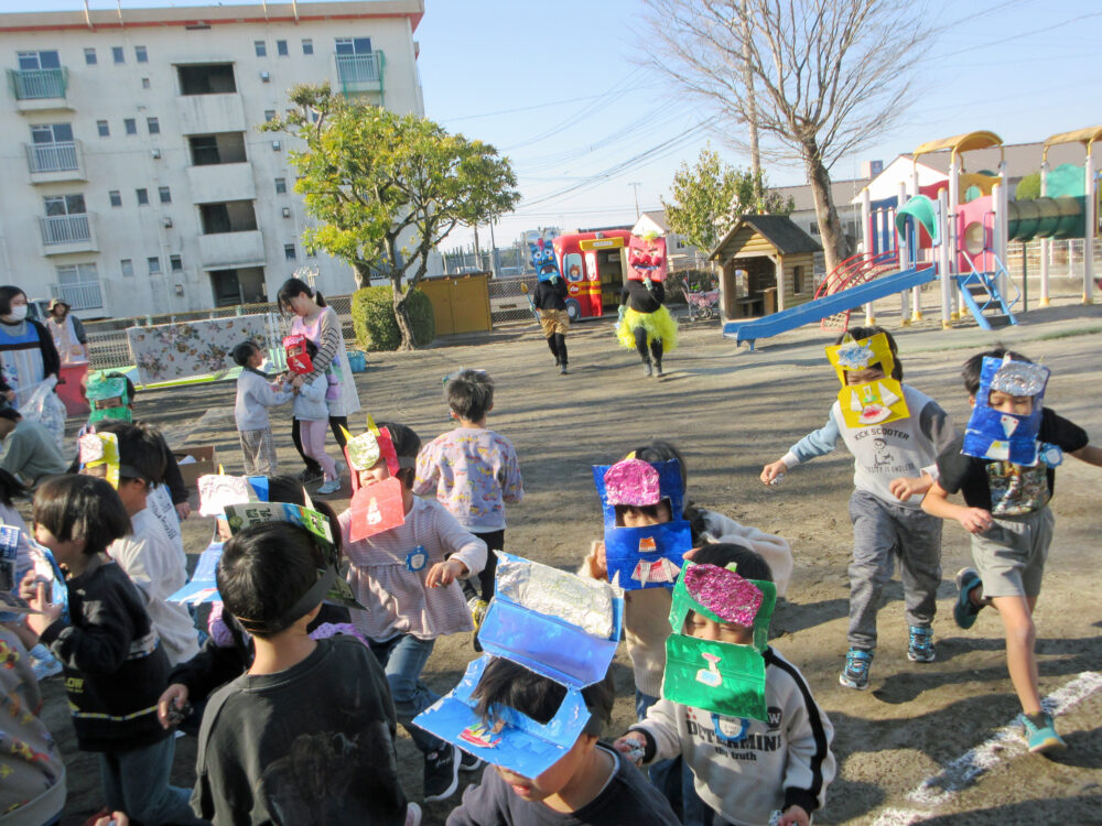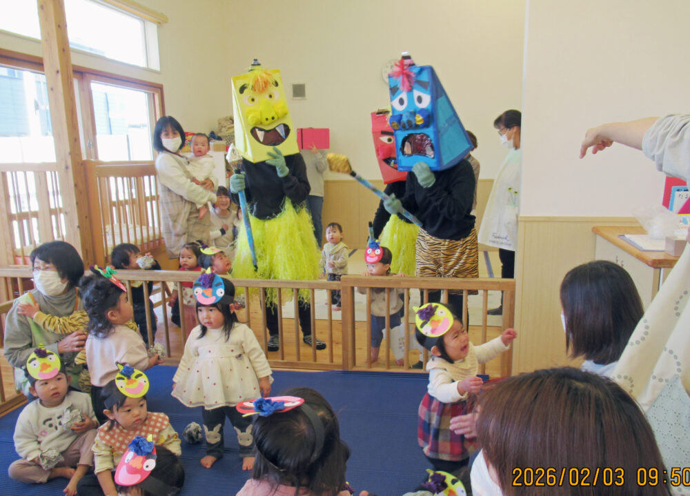 みんなで♪鬼は外♪と歌っていると、どこからともなく現れた鬼! 歌の元気さはどこへやら、逃げます!